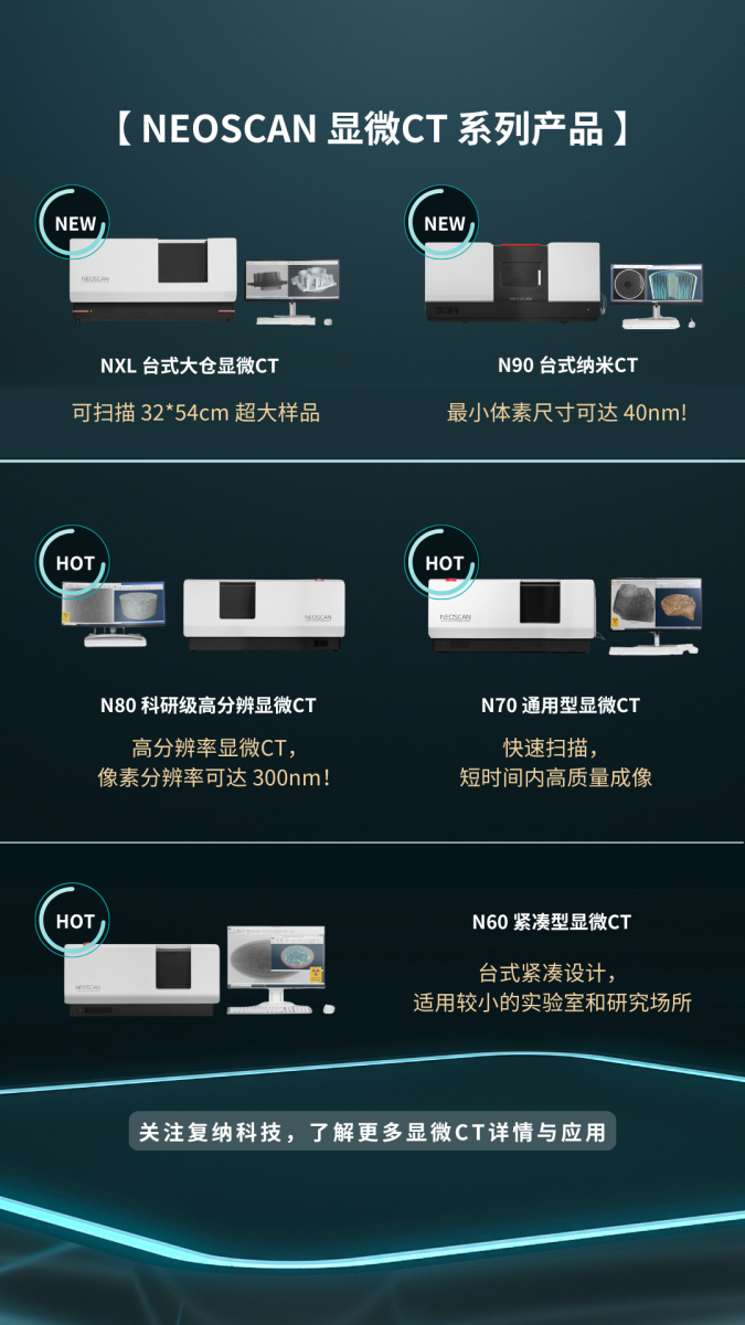 NEOSCAN 台式显微 CT 经过四十年技术沉淀,以精密机械结构与智能图像重建算法为核心,在台式机体积下实现高达 40nm 的像素分辨率,高性能三维无损成像的特性受到众多高校科研与企业用户青睐!它无需切割或制备即可直接观察材料和生物样品内部结构,一次扫描即可获得形貌、裂纹、孔隙、界面及定量信息。