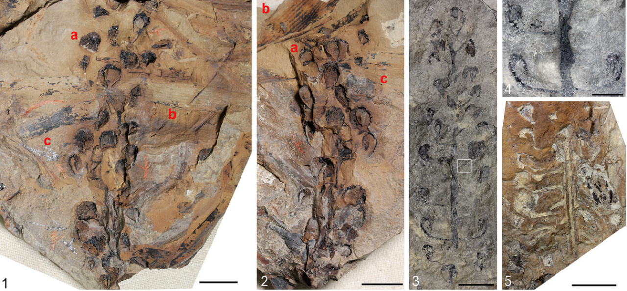 Jarudia borealis 的杯状种子锥整体形态。种子锥呈细长圆柱形,由主轴构成,其上密集排列着侧生的苞片–杯柄复合轴,每个复合轴顶端均发育一个向内弯曲的杯状结构。部分标本中可清晰观察到主轴与侧生生殖单元的附着关系,以及主轴内部的组织分化特征。部分种子锥与大量线形叶片化石伴生,显示其在早白垩世植物群落中的共存关系。