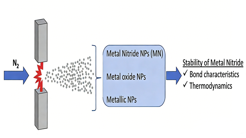 金属氮化物和氧化物纳米颗粒因其独特的物理化学性质(如强等离子体响应、高熔点、化学稳定性和可调电子结构),在催化、传感、能源存储等领域具有广泛应用。传统化学合成方法(如高温氮化、溶胶-凝胶法)通常能耗高、步骤繁琐,且易产生副产物。物理气相法(如火花烧蚀)因其操作简单、环境友好、无需化学前驱体而受到关注。火花烧蚀(VSP-G1 纳米颗粒发生器)通过电极间放电使金属局部蒸发,蒸气经载气淬灭后成核生长为纳米颗粒。尽管已有研究报道其在合成金属氧化物方面的应用,但在氮气中合成金属氮化物及其与氧化物的竞争形成机制尚不明确。本文旨在系统探究大气压火花烧蚀在氮气中合成金属氮化物/氧化物纳米颗粒的可行性,并评估其长期稳定性。