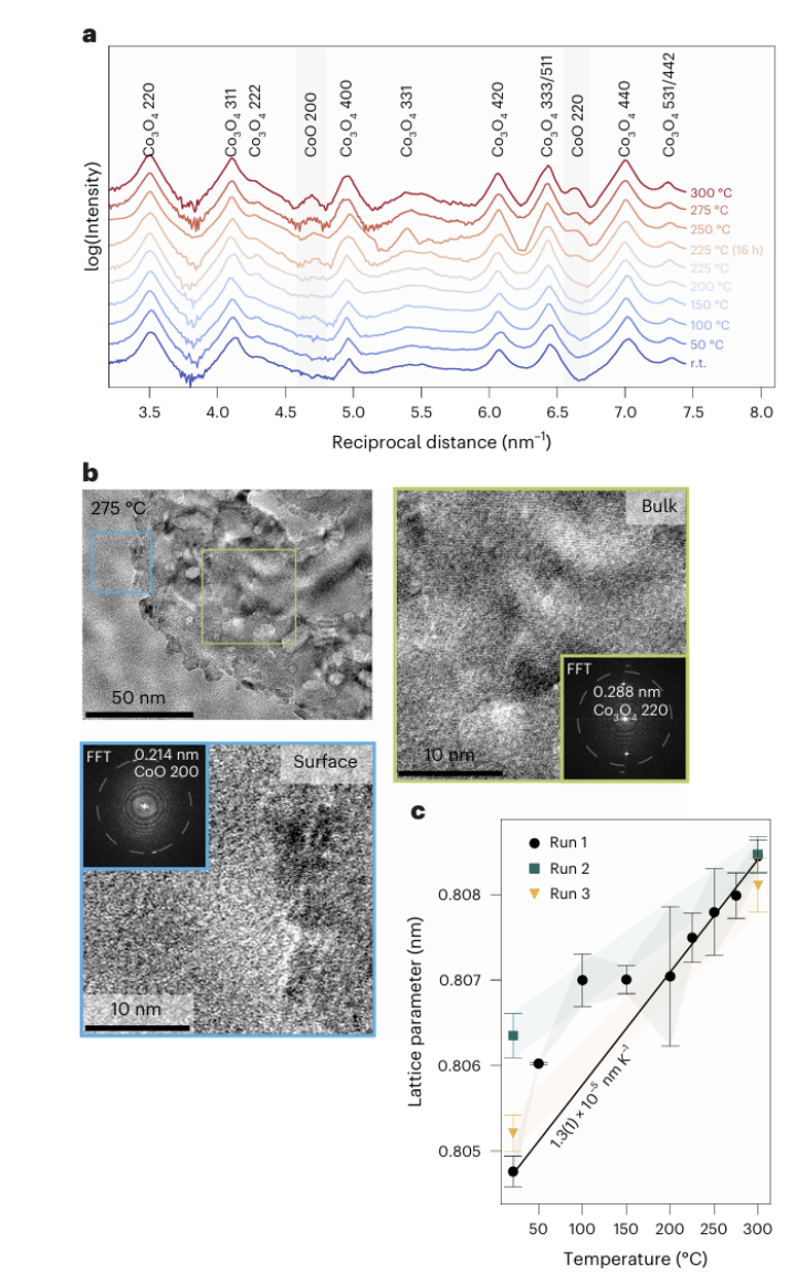 衍射和高分辨数据给出了晶体学证据:(1) 在高温区,表面确实生成了新的结晶相(岩盐矿结构 CoO);(2) 在 200°C 以下的中低温区,主体尖晶石晶格发生了剧烈的异常膨胀,这极有可能归因于为了容纳前期扩散产生的阳离子空位而产生的晶格应变。直到高温区,随着空位的坍塌(形成孔洞)和表面的结晶化,晶格应变才得以释放,恢复正常的线性热膨胀。