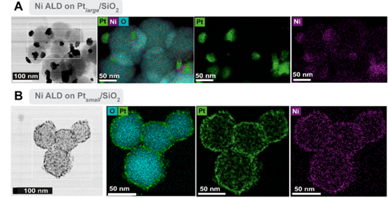 在 200°C 下合成的(A) NiALD/Ptlarge/SiO2 纳米粒子和(B) NiALD/Ptsmall/SiO2 纳米粒子的 STEM 图像和元素