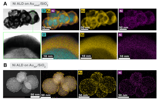 200°C 下合成的(A) NiALD/Aushell/SiO2 和(B) NiALD/AuNP/SiO2 的 STEM 图像和元素映射