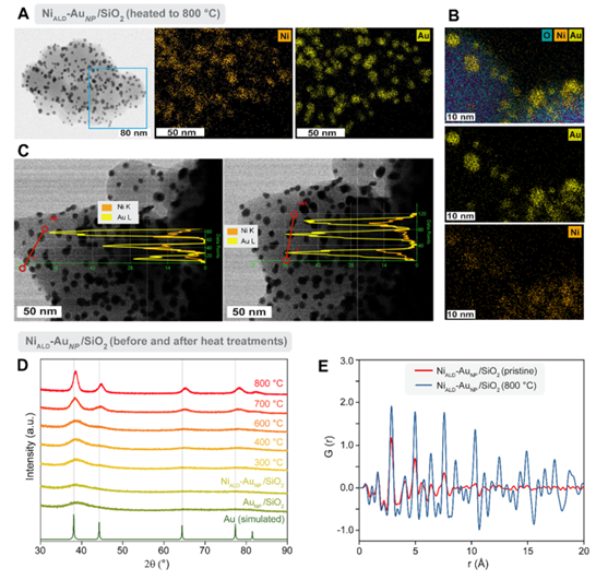 ALD 沉积的镍纳米颗粒碳杂质含量低(约 1%),并且通过研究 Au-Ni 体系,发现镍涂层能显著提升金纳米颗粒的热稳定性,抑制高温烧结,初始的 Au-Ni 核壳结构在加热后转变为均匀的 Au-Ni 固溶体合金。