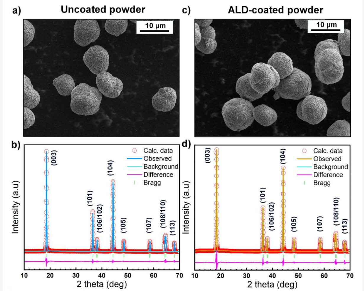 图1. (a) 未包覆和 (b) ALD包覆LNO粉末的扫描电子显微镜(SEM)图像;以及(c) 未包覆和(d) ALD包覆LNO粉末XRD衍射图案的Rietveld精修结果。