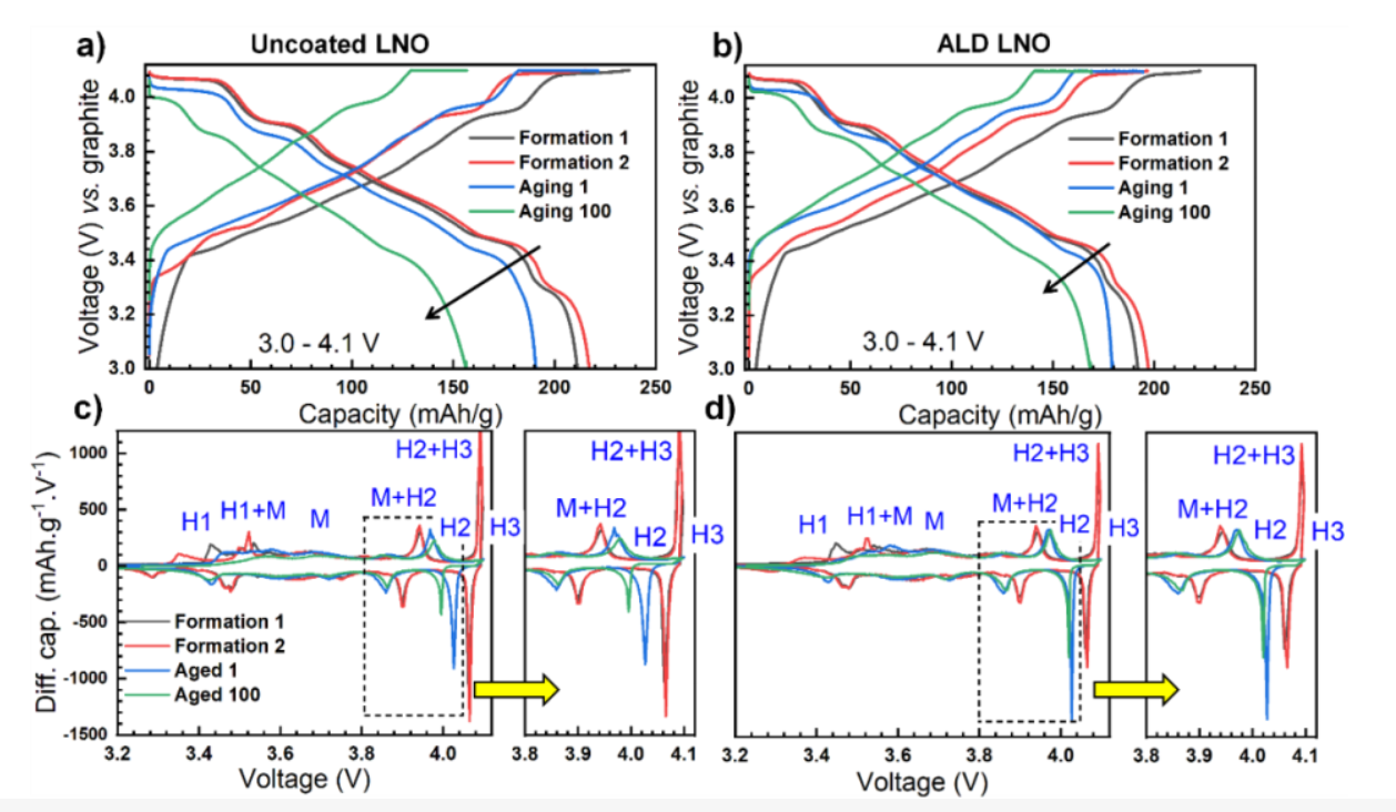 图2. 单层软包电池中(a)未包覆与(b)ALD包覆LNO在3.0–4.1 V vs. 石墨区间若干选定循环的电压-容量曲线;以及(c)未包覆和(d)ALD包覆正极对应的微分容量(dQ/dV)图,所有图的y轴刻度一致。