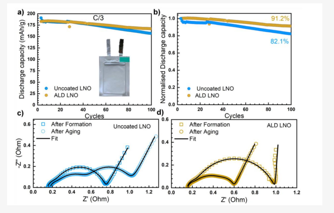 图3. (a) 未包覆与ALD包覆LNO正极在单层软包电池中以C/3倍率在3.0–4.1 V vs. 石墨区间循环时的长期放电容量保持曲线;(b) 对应的归一化放电容量保持率。(c, d)为未包覆与包覆正极在老化前后于3.8 V测得的EIS Nyquist图及其拟合结果。