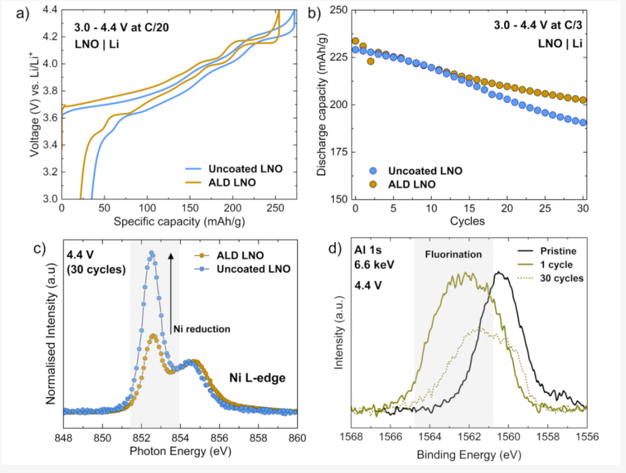 图5:未包覆与ALD包覆LNO正极在半电池(扣式电池)中的电化学数据:(a)3.0–4.4 V区间、C/20倍率下的首圈曲线,(b)C/3倍率长循环性能。(c)循环30圈并充至4.4 V后,未包覆与包覆样品的Ni L-edge软X射线吸收谱;(d)包覆样品在原始态、第1圈和第30圈充电至4.4 V后的Al 1s硬X射线光电子能谱(HAXPES,激发能6.6 keV)。