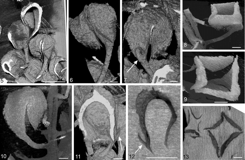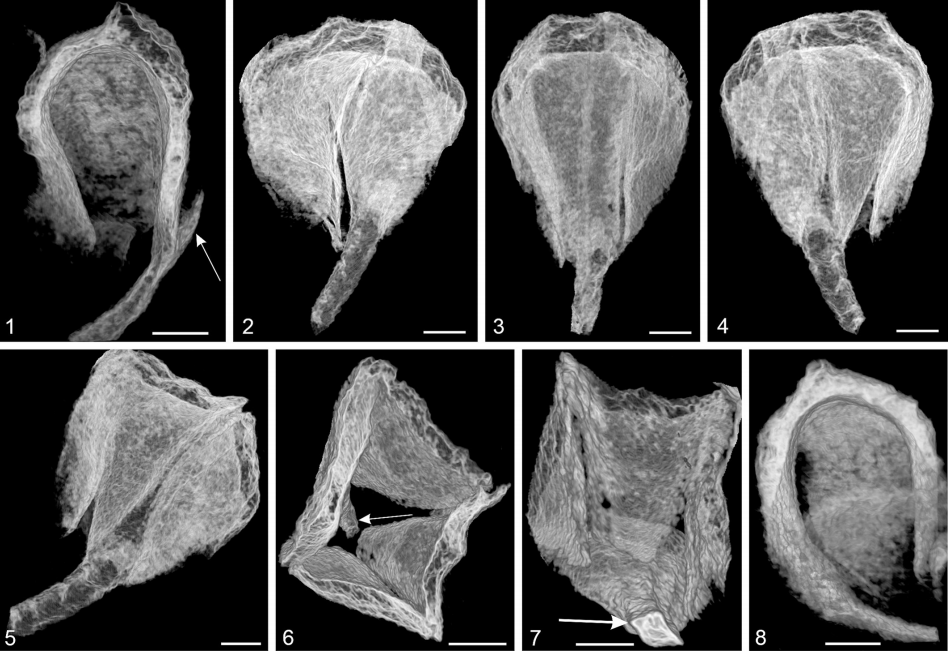 Jarudia borealis 杯状结构的显微 CT 半透成像。显微 CT 半透成像展示了 Jarudia borealis 杯状结构的三维形态及内部构造。纵向切面可见细长的杯柄、苞片游离且尖锐的顶端,以及杯体顶端短小的突起结构。三维重建结果显示,杯柄横截面呈菱形,并向远端扩展形成由一个中部瓣片和两个侧瓣组成的向内弯曲杯状结构,同时可区分杯体的内、外角质层。