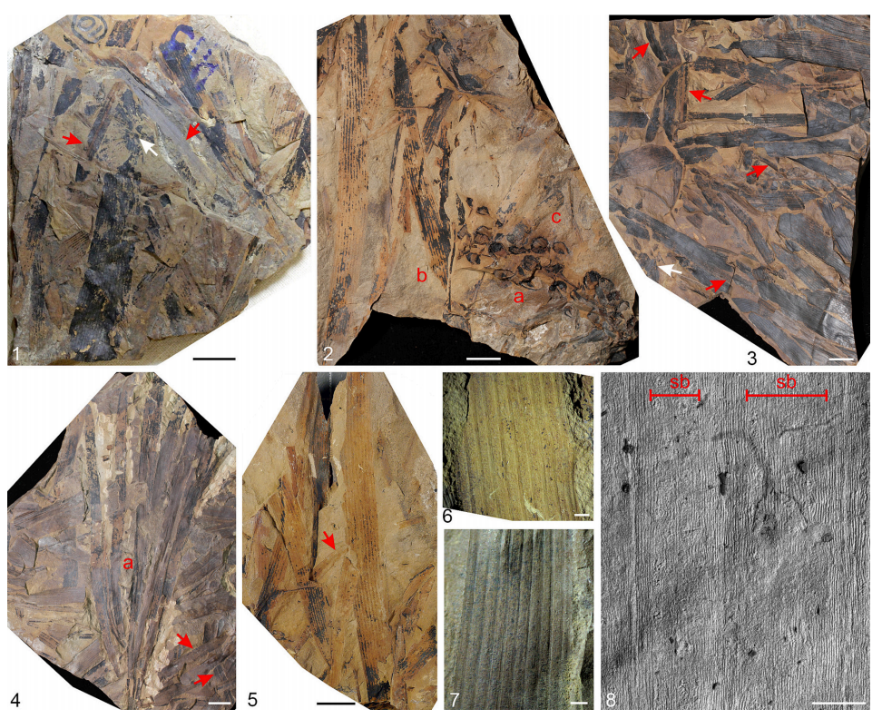 两类新化石植物(Phoenicopsis arcticus 与 Jarudia borealis)的宏观叶片形态和表皮特征:大片平行脉叶碎片中偶见 Pityophyllum 与 Ginkgoites 残片,指示原地或近源混合堆积;图 2 首次出现带杯球的生殖枝,证实 Phoenicopsis 的繁殖器官;图 6-8 的放大图显示叶片脉间带与气孔带交替排列的微观结构,支持其适应高纬度湿润环境的生态特征。整体反映阿普特–阿尔比期北极群岛的温带针阔混交林植被面貌。