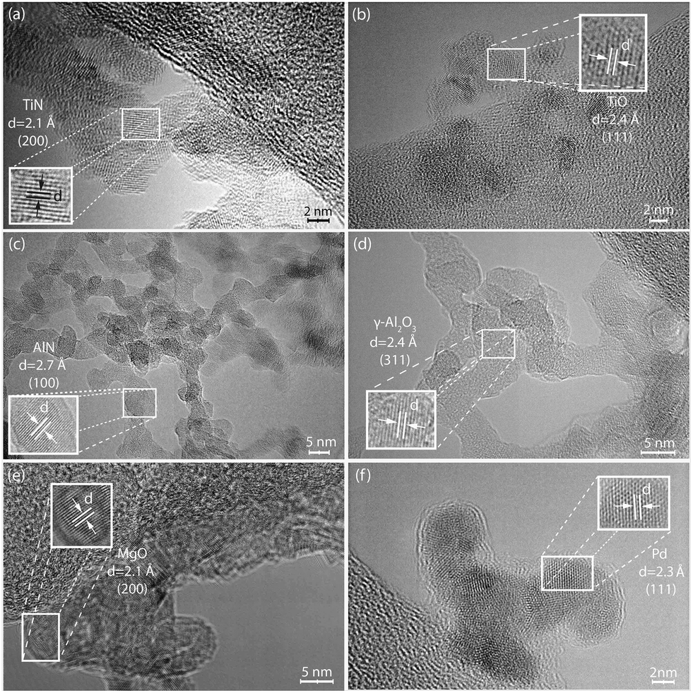 XRD 和 TEM 确认了各物相的晶体结构,d 间距测量结果与标准卡片吻合。晶体尺寸通过 Scherrer 公式估算:TiN 约 37.8 nm,AlN 约 14.4 nm,γ-Al₂O₃ 约 18.4 nm,MgO 约 51.8 nm,Pd 约 54.1 nm。