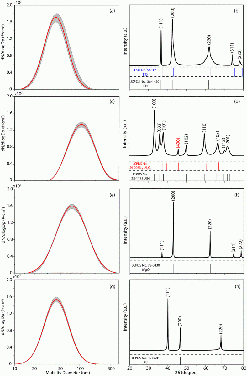 在 SDG 中使用(a)和(b)Ti,(c)和(d)Al,(e)和(f)Mg,以及(g)和(h)Pd 电极,N₂ 作为载气时,SMPS 测量的沉积 NP 颗粒大小分布(左图)和 XRD 系统绕射图(右图)。XRD 测量中括号内的数字是米勒指数,而绕射图下方的线条显示对应文库的数据。