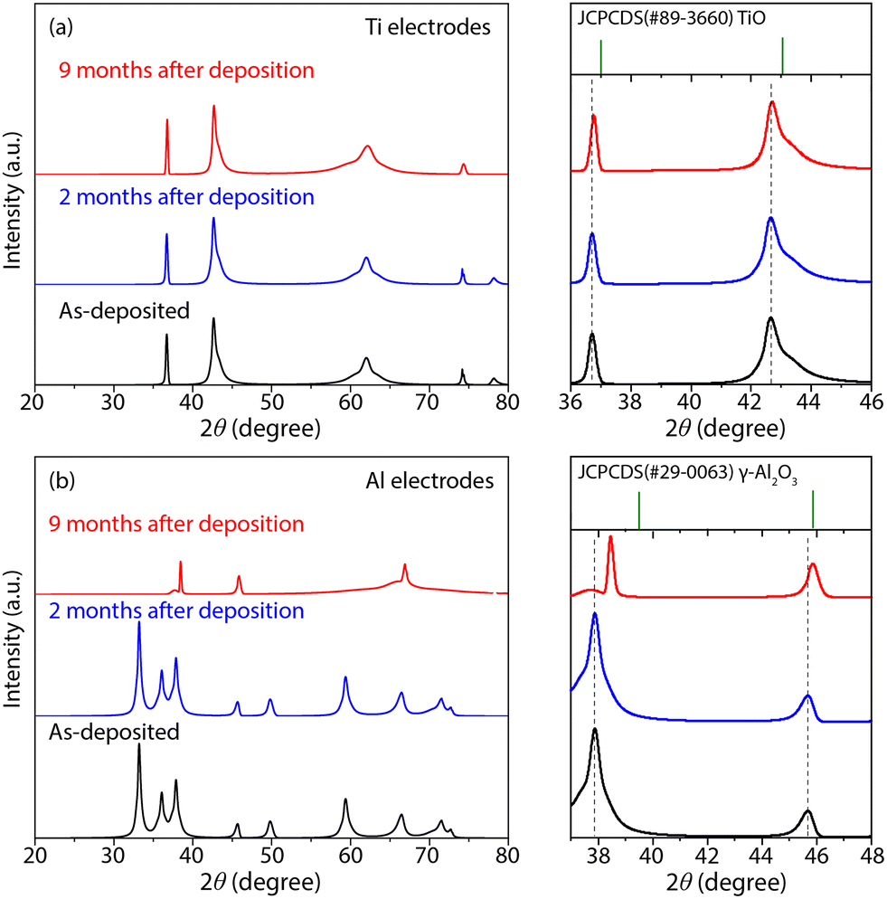 SDG 在 N₂ 流下使用(a)Ti 和(b)铝电极产生的 NP 样品的 XRD 分析。样本在合成后立即(黑色曲线)、两个月后(蓝色曲线)和九个月(红色曲线)进行分析。右侧的图展示了 Ti(顶部)2θ = 36–46°的衍射图细节,以及 Al(底部)电极 2θ = 37–48°的绕射图,以及来自 TiO 和γ-Al₂O₃(绿色)库的数据。
