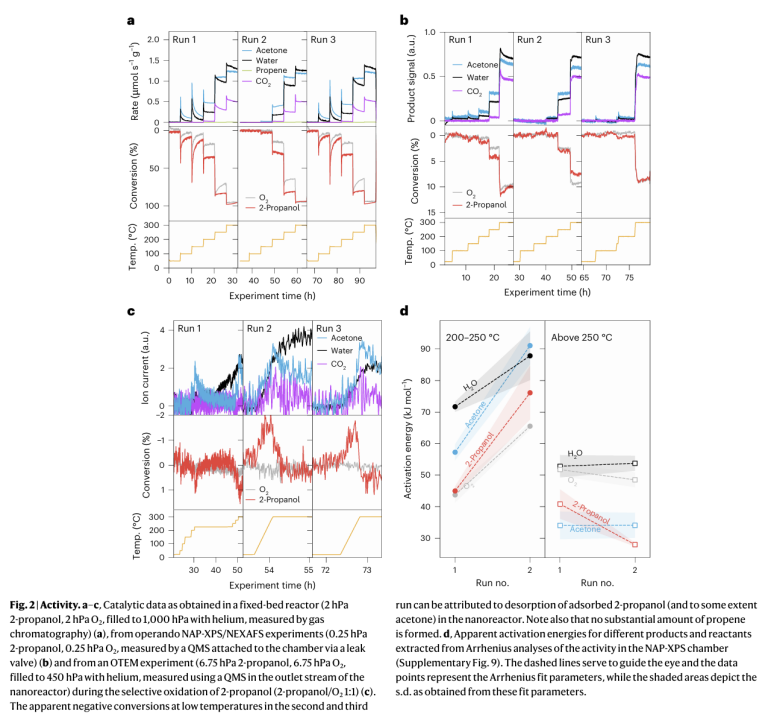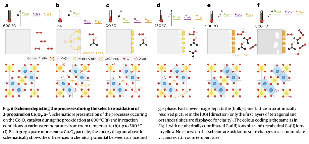 作者将原本静态的催化机理,升格为一幅动态的、受化学势梯度驱动的固态相演变图景。从室温起,气相(异丙醇还原性)与体相(高价氧化物)的化学势差异,驱动了体相阳离子向表面迁移(溶出),导致表面失氧和还原(对应 Fig 3),同时在体相留下空位导致晶格异常膨胀(对应 Fig 5c)。随着温度升高,空位聚集成纳米孔洞(对应 Fig 4),表面无定形溶出物最终在 225°C 以上结晶为稳定的 CoO 相(对应 Fig 5a, b)。