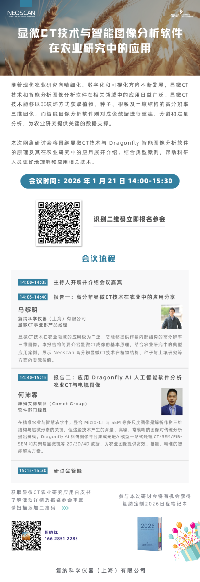 本次研讨会将于 2026 年 1 月 21 日 14:00 举行,由复纳科学仪器(上海)有限公司主办。会议将围绕显微 CT 成像技术和 Dragonfly 智能图像分析软件展开,结合实际案例,展示其在农业科研中的应用潜力,助力相关研究人员提升数据获取与分析能力,推动农业研究方法的创新与发展。
