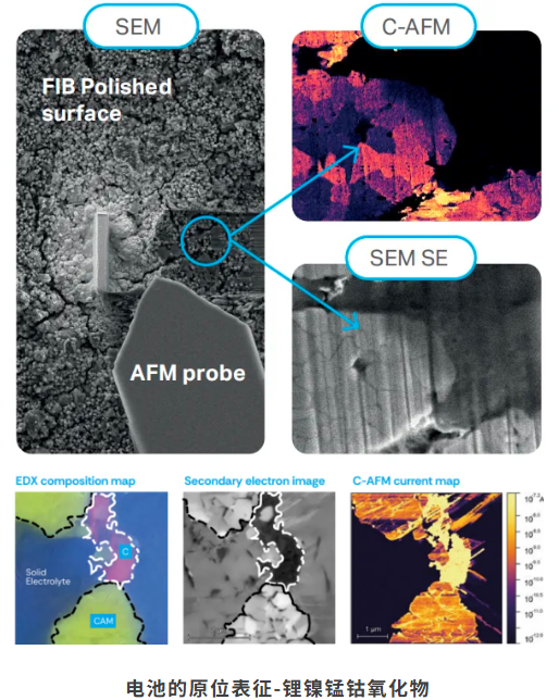 SEM 成像识别了感兴趣的抛光区域。EDS 图显示了正极胶带的组成,包括固态电解质、NMC 颗粒和碳添加剂。C-AFM 确认了碳添加剂的导电性及其在连接性中的作用。这种 AFM-in-SEM 相关性有助于在不改变样本表面的情况下识别材料功能或故障。