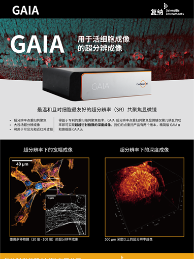 GAIA 是 Confocal NL 推出的旗舰超分辨率共聚焦模块,得益于专利的 REsacn (多重扫描技术),GAIA 超分辨率点重扫共聚焦显微镜仅需几纳瓦的功率即可实现超越衍射极限的深度成像。